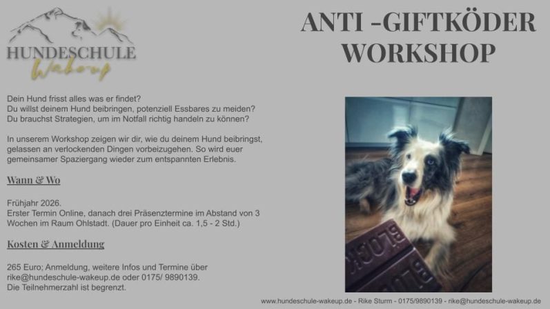 U.a. zu folgenden Themen: Hund & Kind, Erste Hilfe am Hund, Anti- Giftköderkurs, Trickdog Seminar, Nasenarbeit, Hund am Berg