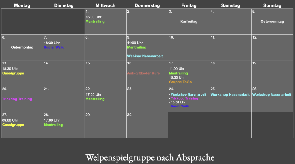 Voraussetzung für die Teilnahme an unseren Gruppen (außer Welpengruppe) ist ein vorheriges Kennenlernen/Einzelstunde. Für die Welpenspielgruppe bitten wir um Anmeldung.